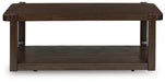 If casual contemporary style is your thing, then you'll love this coffee table. Its thick tabletop, softly rounded corners and dark wood-tone finish lend a soothing sensibility. Rearranging your living room layout? The included casters make it easy to move. Sleek and smart, this piece is a fresh take on cool for the modern home.