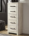 | Details | Made of engineered wood (MDF/particleboard) and decorative laminate, Wispy white finish over replicated oak grain with authentic touch, Large-scale hardware with dark finish, 5 smooth-gliding drawers, Drawer interiors are lined with a faux linen laminate for a clean, finished look, Safety is a top priority, clothing storage units are designed to meet the most current standard for stability, ASTM F 2057 (ASTM International), Drawers extend out to accommodate maximum access to drawer interior while maintaining safety | |