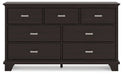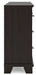 | Details | Made with hardwood solids, engineered wood veneer and MDF substrates, Dark brown finish, Metal bar pulls with bright nickel-tone finish, 7 smooth-gliding drawers with dovetail construction and metal center guides, Drawer interiors are lined with a wood grain laminate for a clean, finished look, Top moulding | |