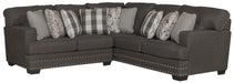 The contemporary farmhouse styling of the Crawford sectional brings comfort and style to any room. The seats are constructed of individually pocketed coils encased in foam and topped with a layer of cool gel infused memory foam for a long lasting, comfortable and supportive seat. Covered in a soft durable 100% polyester fabric the Crawford is durable enough for use in a family room, basement or bonus room. The exceptional styling shows through with the included decorator accent pillows and nickel nail head accents along the base rail.