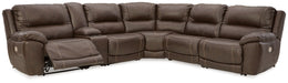 Load up on comfort in a cool, clean-lined and contemporary way with this power reclining sectional in chocolate brown. Rest assured, the expertly matched leather and faux leather upholstery is enriched with a pebble grain effect for authentic appeal and enhanced with jumbo stitching for dramatic contrast. It features a one-touch power control with adjustable positions, along with an Easy View™ adjustable headrest that allows a primo view of the TV even when you're reclined. Extended ottomans provide extra length for leg comfort. A zero-draw USB plug-in at your fingertips lets you charge up as you chill out.
