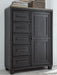 This door chest is casual contemporary style simply done right. Its two-tone color scheme features a rich brushed black main color accented with a beautiful dusty grayish brown wood tone. And there's plenty of storage to accommodate your wardrobe needs with ease. The dresser has 5 soft-close drawers, and behind the door you'll find pull-out trays for shoes or other accessories, along with shelving for bulky items.
