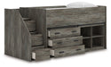 | Details | Includes loft bed, left storage steps with loft ends, roll slats, loft bookcase and loft drawer storage, Made with engineered wood (MDF/particleboard/plywood) and decorative laminate for the right balance of affordability and durability, Rustic warm gray finish over replicated oak grain with authentic touch, Decorative laminate replicates natural or man-made material surfaces with consistent color, pattern and texture, 4 storage cubbies, 3 smooth-gliding storage drawers, Bed does not require additional foundation/box spring, Mattress available, sold separately, Assembly required | |