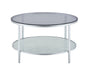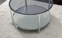 Smoky glass tops, a patterned mirror shelf and a chrome base combine to add sparkle and glam to a room in this romantic Cocktail Table. Frostine features a round shape that softens a room and makes it easier to navigate by eliminating pesky corners. Use with a Sectional or Sofa and Loveseat sets to add a glamorous touch to your home base.