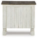 What a fresh interpretation of country classic style. Inspired by American farmhouse craftsmanship, but with an elevated sensibility, this chairside end table blends distinctive details such as turned post accents and raised door fronts for a substantial look that feels right at home. Those who appreciate rustic character should take note of the table’s thick crown moulding, beautified with a vintage two-tone finish. A small flip lid located on the top conceals a power outlet and USB ports to keep electronics charged up and close at hand