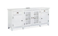 Heron Cove - Entertainment Console. 2 wood framed glass doors in the center. 2 adjustable Wood shelves behind the doors. 2 felt lined top side drawers. 1 adjustable Wood shelf behind each left and right wood door. Side mount ball bearing guides. Wire management. Set of power supply and USB charger.