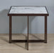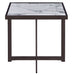 Sleek sophistication takes center stage with the Kayley sintered stone side table. This modern marvel features a striking sintered stone inlay atop a nickel-finished iron base, marrying elegance with durability. Supported by a sled base with cross stretchers, it offers both style and stability.