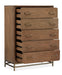 With its sophisticated, squared silhouettes and modern lines, Lindon is nothing short of iconic. A Lindon bed makes a bold design statement in any bedroom while creating an undeniable focal point. Dress it up or down, traditional or modern - its beauty has no limits. The coordinating casegoods in this group convey Lindon's streamlined personality while design details such as open metal bases tie all the pieces together. Alluring finishes of Belgian Wheat and Coffee Bean highlight the group's random Cathedral/ Quartered Knotty White Oak veneers and hardwood solids. Burnished Brass hardware adds a finishing touch to this expressive bedroom collection.