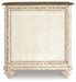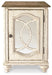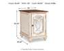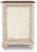 Elevating the art of traditional cottage styling, this chairside end table is sure to serve you beautifully for years to come. Antiqued two-tone aesthetic blends a chipped white with a distressed wood finished top for added charm. Cabinet door features inset mirror with filigree moulding for a fanciful twist.