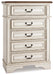 Elevating the art of traditional cottage styling, this chest of drawers is your dream bedroom retreat realized. Antiqued two-tone aesthetic blends a chipped white with a distressed wood finished top for added charm. Framed drawer fronts and decorative corbels add refinement, while bail pulls in a dark bronze-tone finish lend a classic touch.