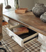Elevating the art of traditional cottage styling, this desk is your heavenly home office realized. Its antiqued two-tone aesthetic blends a chipped white with a distressed wood tone top for added charm. Framed drawer fronts, decorative corbels and elegantly turned and tapered legs add refinement, while dark bronze-tone knobs lend a classic touch. And this desk is also built for productivity. A spring lift top raises the surface to a comfortable standing position, while the built-in power supply and dual USB ports keep your devices close at hand and ready to go.